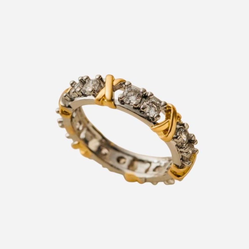 Anel zircônias confeccionado em mix de banhos - ouro e ródio branco.