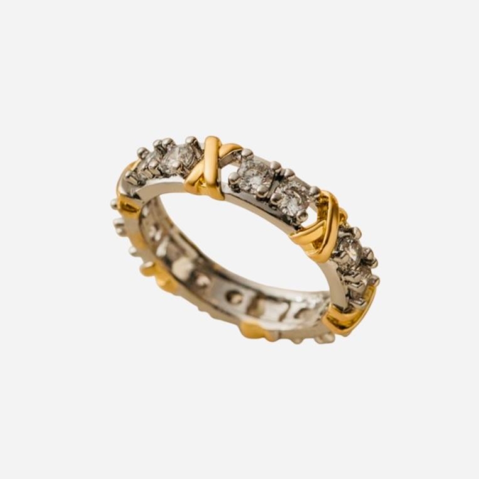 Anel zircônias confeccionado em mix de banhos - ouro e ródio branco.