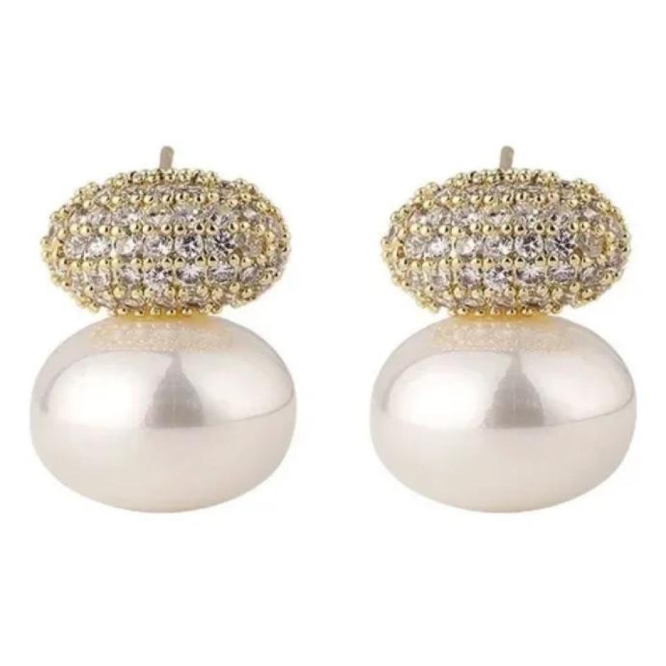 Brinco confeccionado em banho de ouro 18K, pérola sintética e zircônias.
