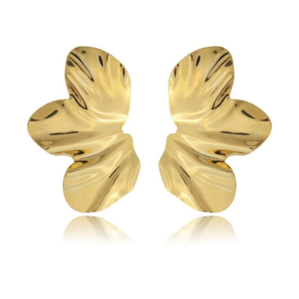 Banhado a ouro 18K, o modelo valoriza o brilho do metal e evidencia o movimento das dobras sutis, que remetem à textura natural das folhas. O formato amplo e fluido confere presença e elegância, destacando o rosto com leveza.