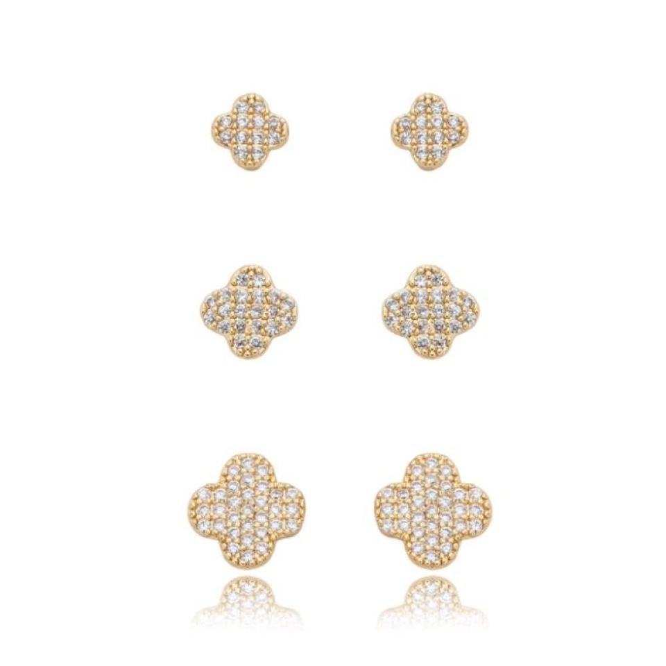 Trio de brincos zircônias confeccionado em banho de ouro 18K.